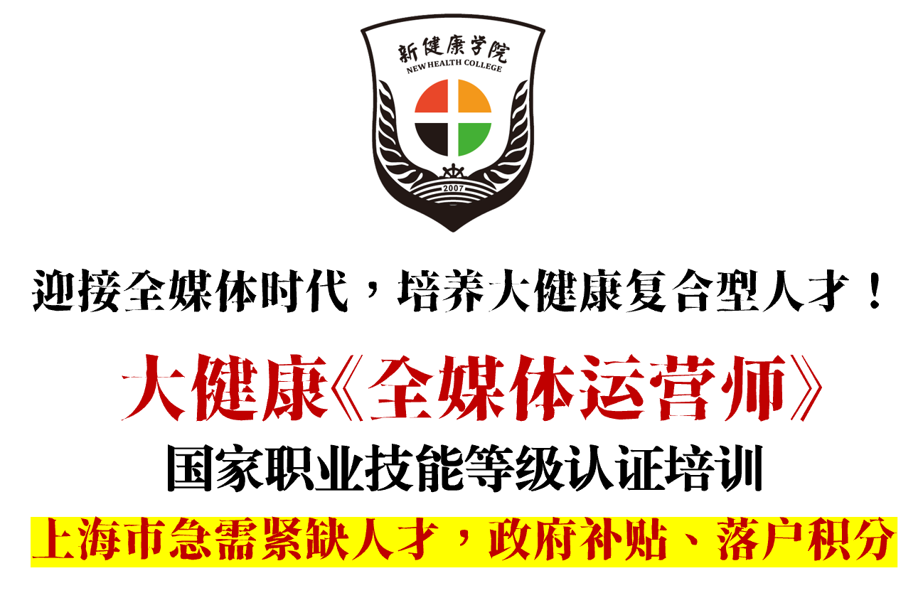 在“健康中国”战略与数字经济浪潮的双重驱动下,全民健康意识空前提升,大健康产业正经历深刻的数字化转型。行业普遍面临“专业内容创作难、公域流量变现难、用户信任建立难”三大痛点。为培养既懂健康管理又掌握全媒体运营的复合型领军人才,上海新健康进修学院现重磅推出《全媒体运营师》国家职业技能等级认证培训。考试合格,不仅可获得国家权威认证,更可享受多重政府补贴、上海落户积分等重磅优待,助你抢占职业发展制高点。